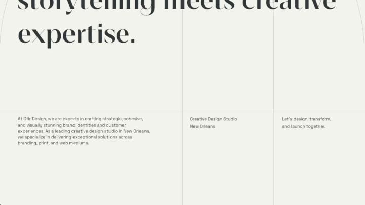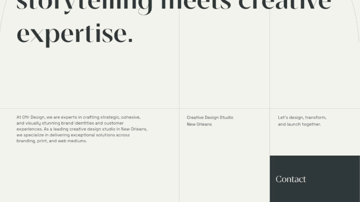 最初に紹介するのは、アメリカ・ニューオリンズに拠点を置くクリエイティブデザインスタジオ「Ofir Design」のWebサイトです。同社はブランディングをはじめ、紙媒体やWebサイトのデザインなどを幅広く手掛けています。