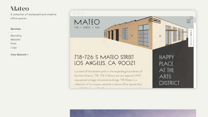 解説テキストの直後にはWebサイトが埋め込まれており、実際のサイトへ移動せずにスクロール操作に伴う動きを確認できます。さらにスクロールを進めると制作事例の画像が現れ、マウスオーバーするとわずかに縮小するアニメーションが加えられています。細部にまで動きが設計されており、閲覧者に心地よいリズムを感じさせます。