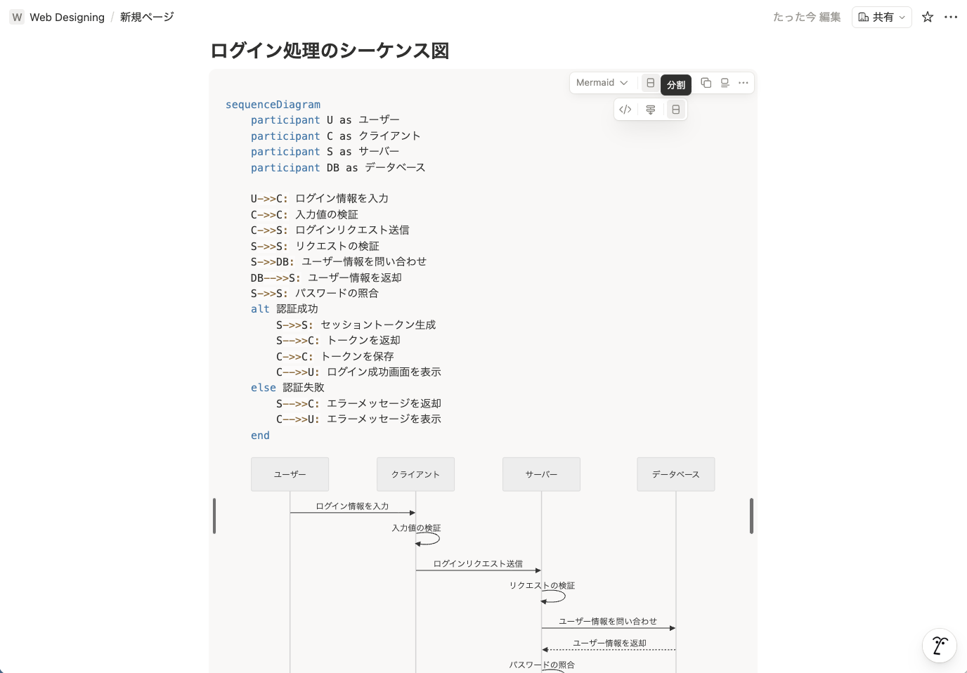 もちろん、作成したいシーケンス図やフローチャートの手順をプロンプトで詳細に指示したほうが、より理想的なアウトプットを得られます。ただし、Mermaid記法に詳しくない場合は、まず大まかなベースを作成してもらい、あとからコード表示に切り替えて必要な箇所を修正するとよいでしょう。