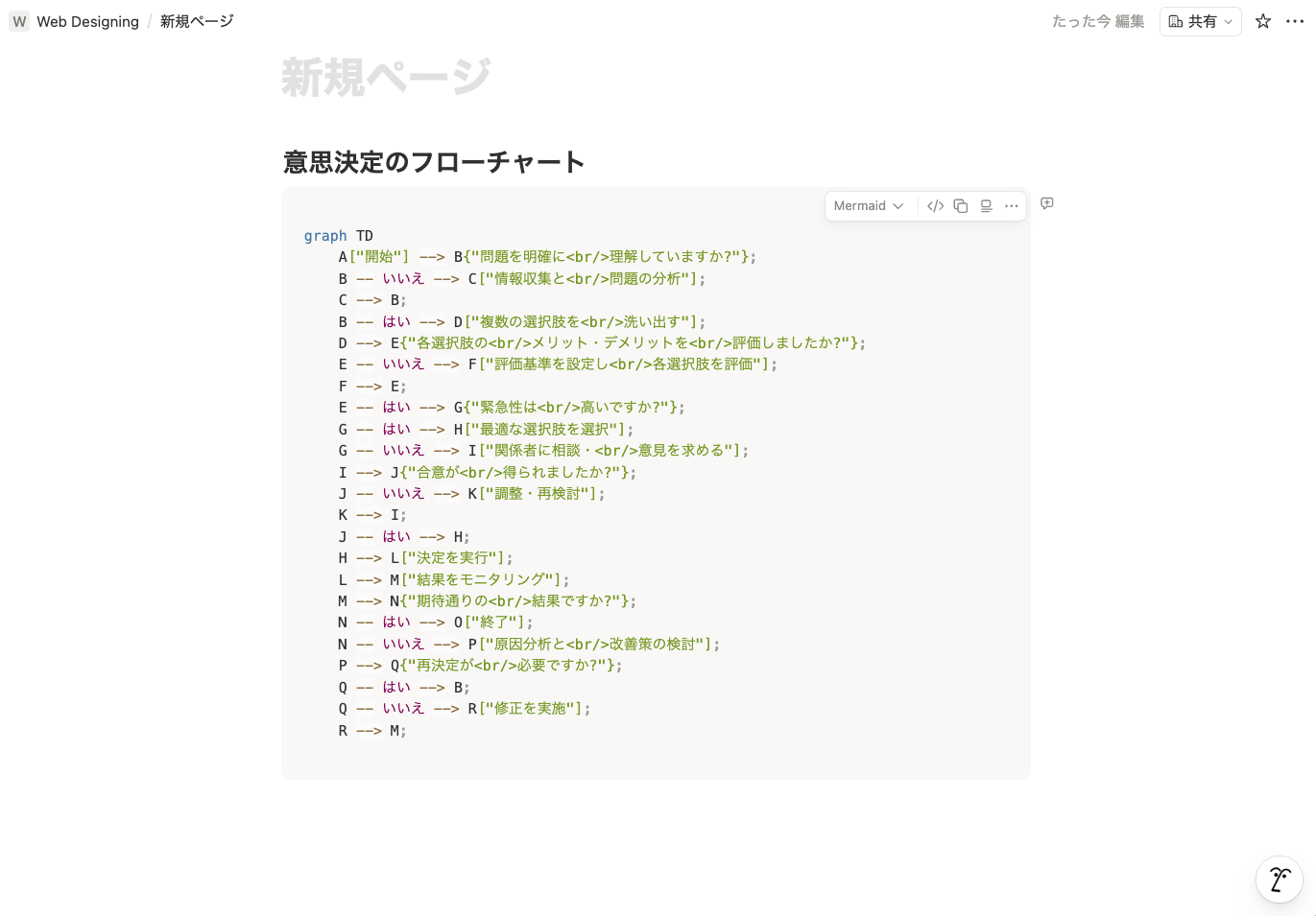 このようにまずNotion AIを利用してみれば、Mermaid記法に不慣れな人でも自然に理解を深めることができるはずです。