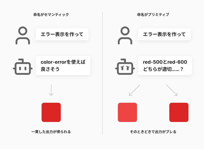 例えば、color-red-500というプリミティブな名前だと、AIにとっては「赤い色」という情報しかありません。そうすると「エラー表示を作って」と指示したときに、red-500を使うこともあればred-600を使うこともあります。つまり、周辺のコードなどに影響されて、出力が定まらないのです。