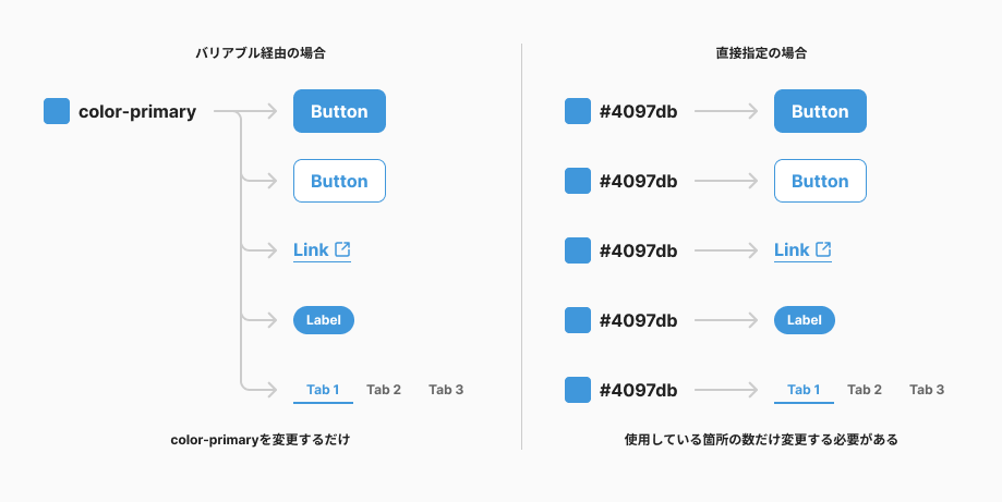 プライマリカラーを変更したいとき、バリアブルで管理されていれば1カ所の変更で済みますが、値が直接指定されているコンポーネントが10個あれば、10箇所を手動で探して修正する必要が出てきます。