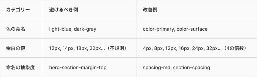 spacing-md、spacing-lgのようにかなり抽象的な名前にするか、section-spacing、card-spacingなど少し具体性を持たせるかはプロダクトによりますが、いずれにしてもある程度抽象度を上げておいた方が再利用性が高く、管理もシンプルです。