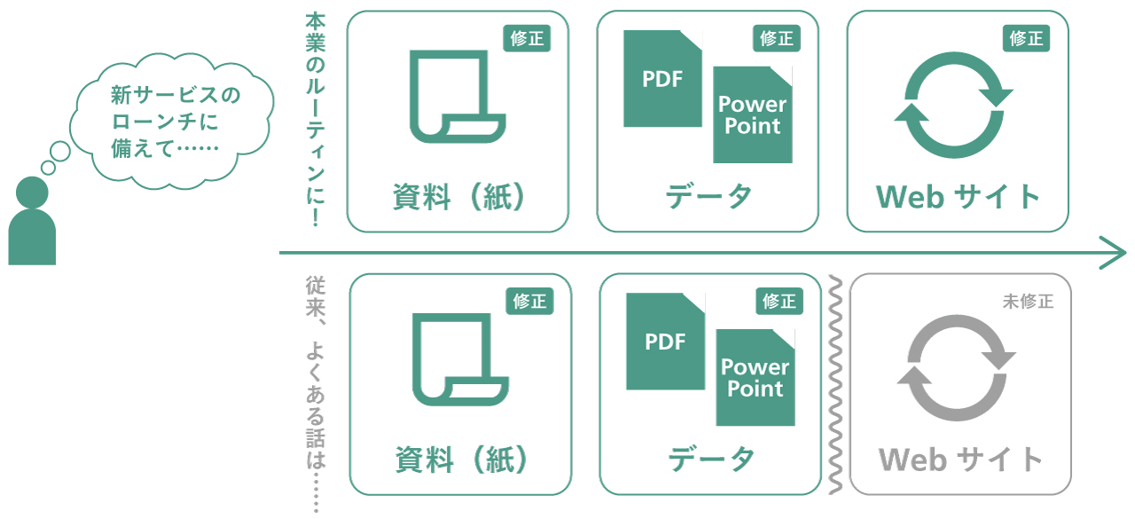 現場でよくあるのは、新商品や新サービスをローンチした直後、営業資料にはきちんと最新情報が反映されているのに、Webサイトだけは古い情報のまま、というケースです。