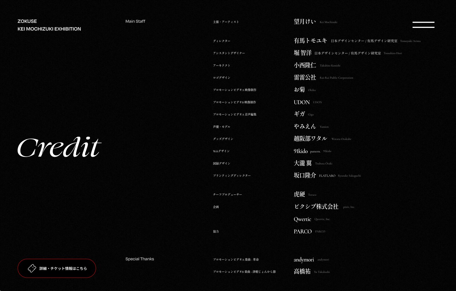 本展では会場の設営から図録などの紙媒体、Web、プロモーションビデオなどが制作されました。ディレクターの有馬さんを始め、ロゴデザインは雷雷公社、グッズデザインは越阪部ワタルさんと錚々たるメンバーがクレジットされています。