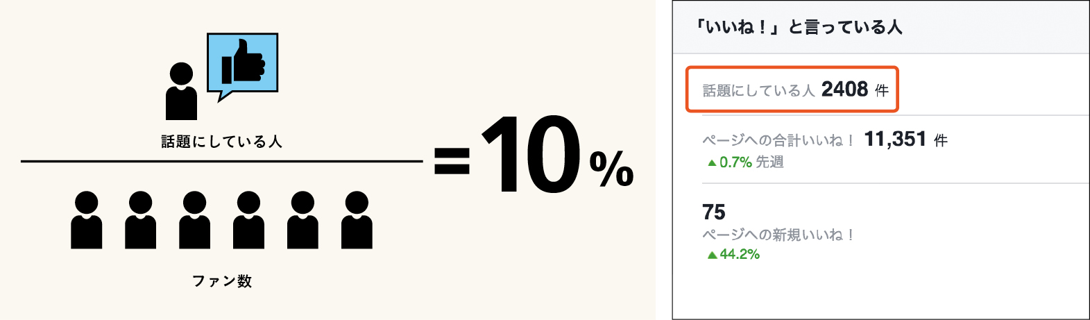 この数値の目安は「話題にしている人」÷「ファン数」=10%(ただしファン数が増加すると率は低下する)。この数値をクリアしていれば、ファンからの支持を得られているFacebookページであると考えてよい。Facebookページによってはこの数値が1%に満たないケースもあり、抜本的な対策が必要となる。